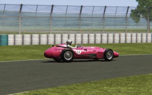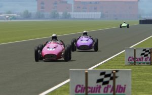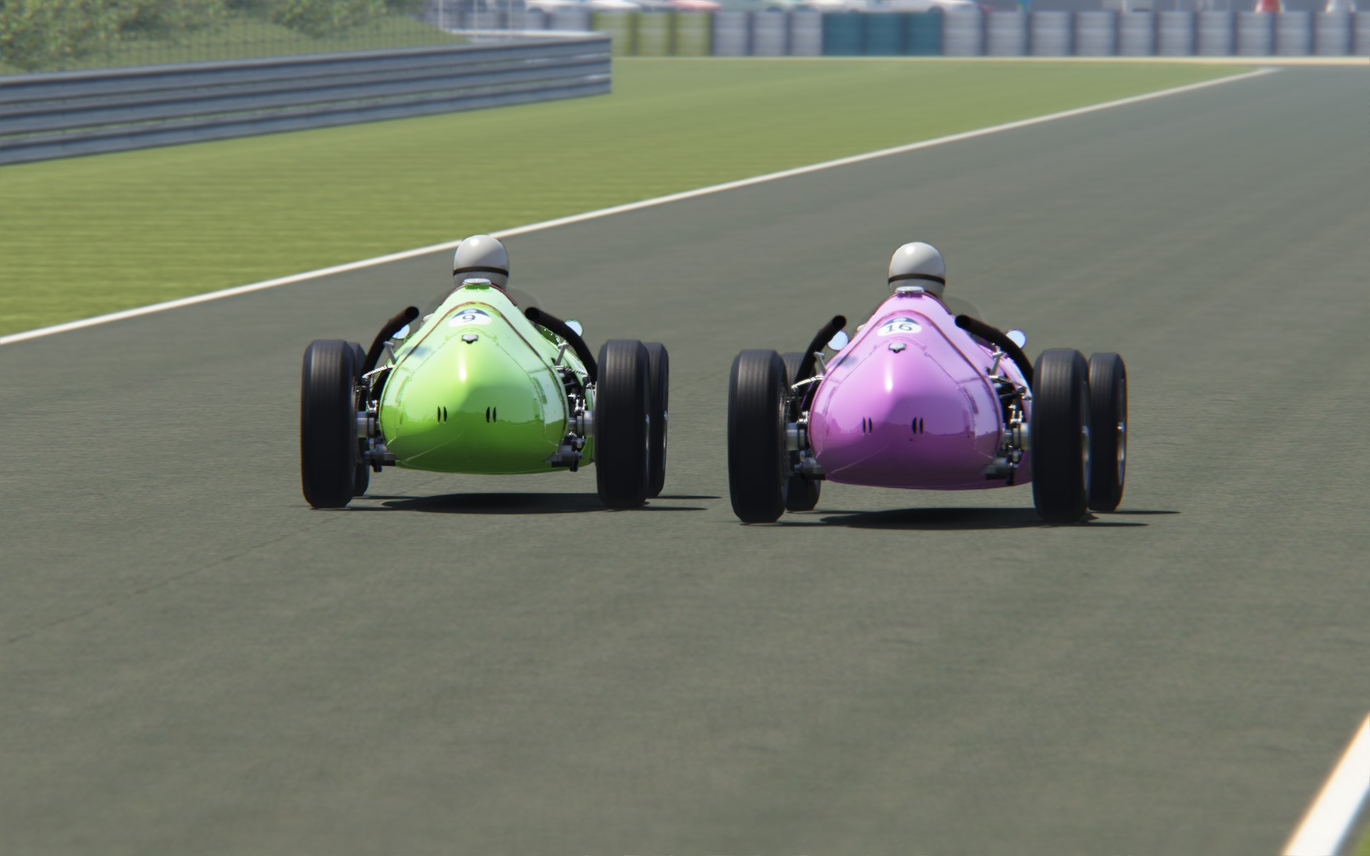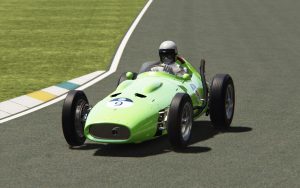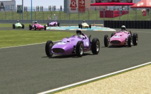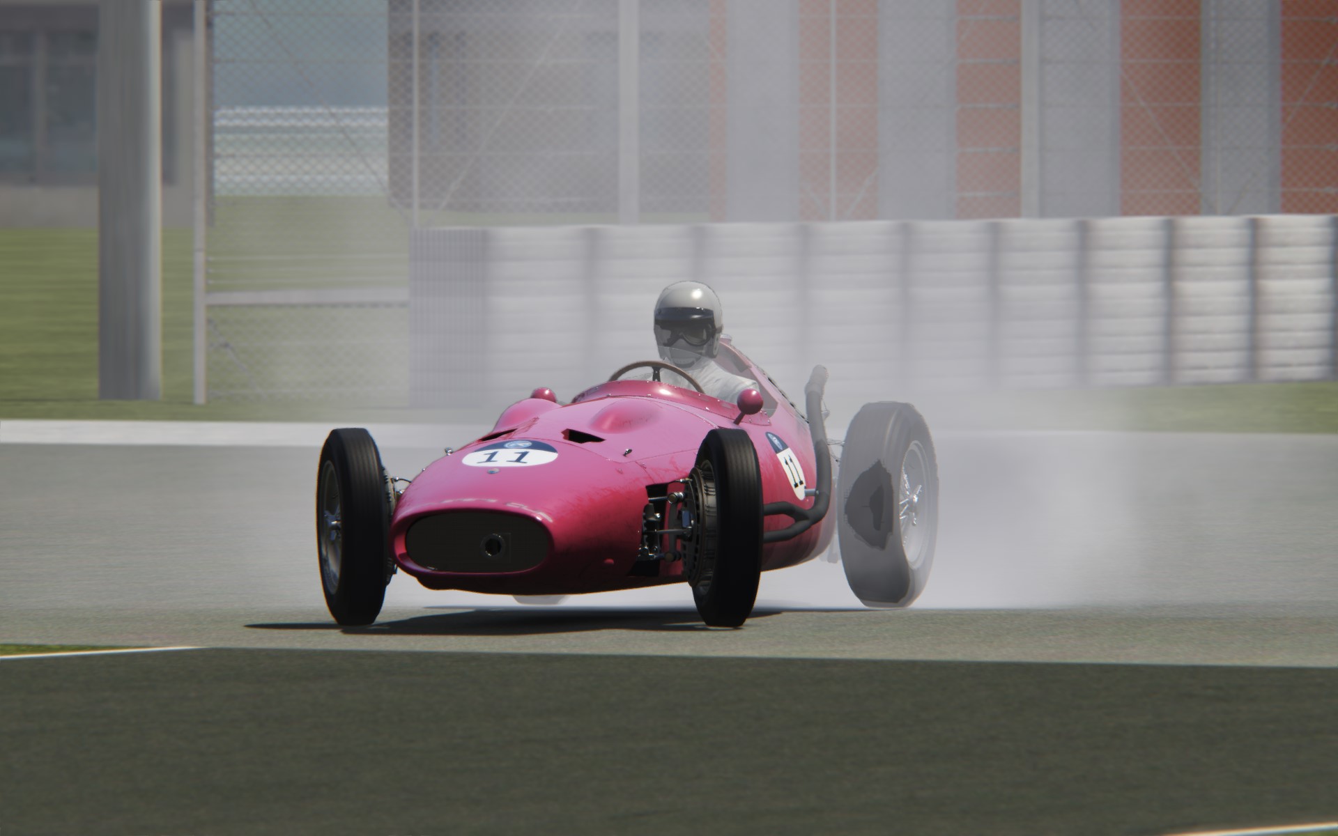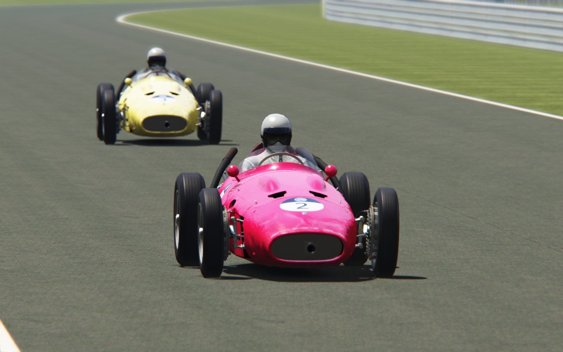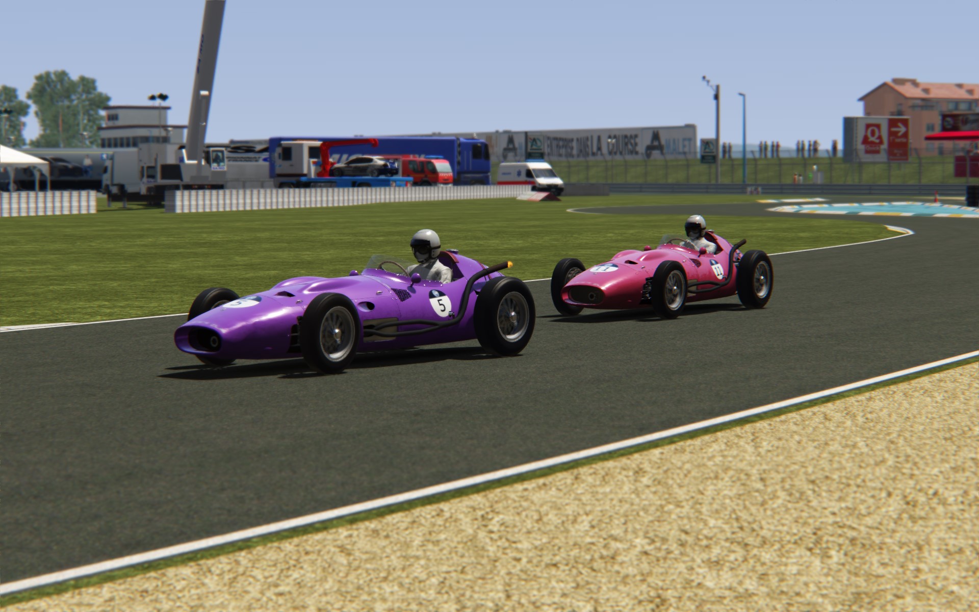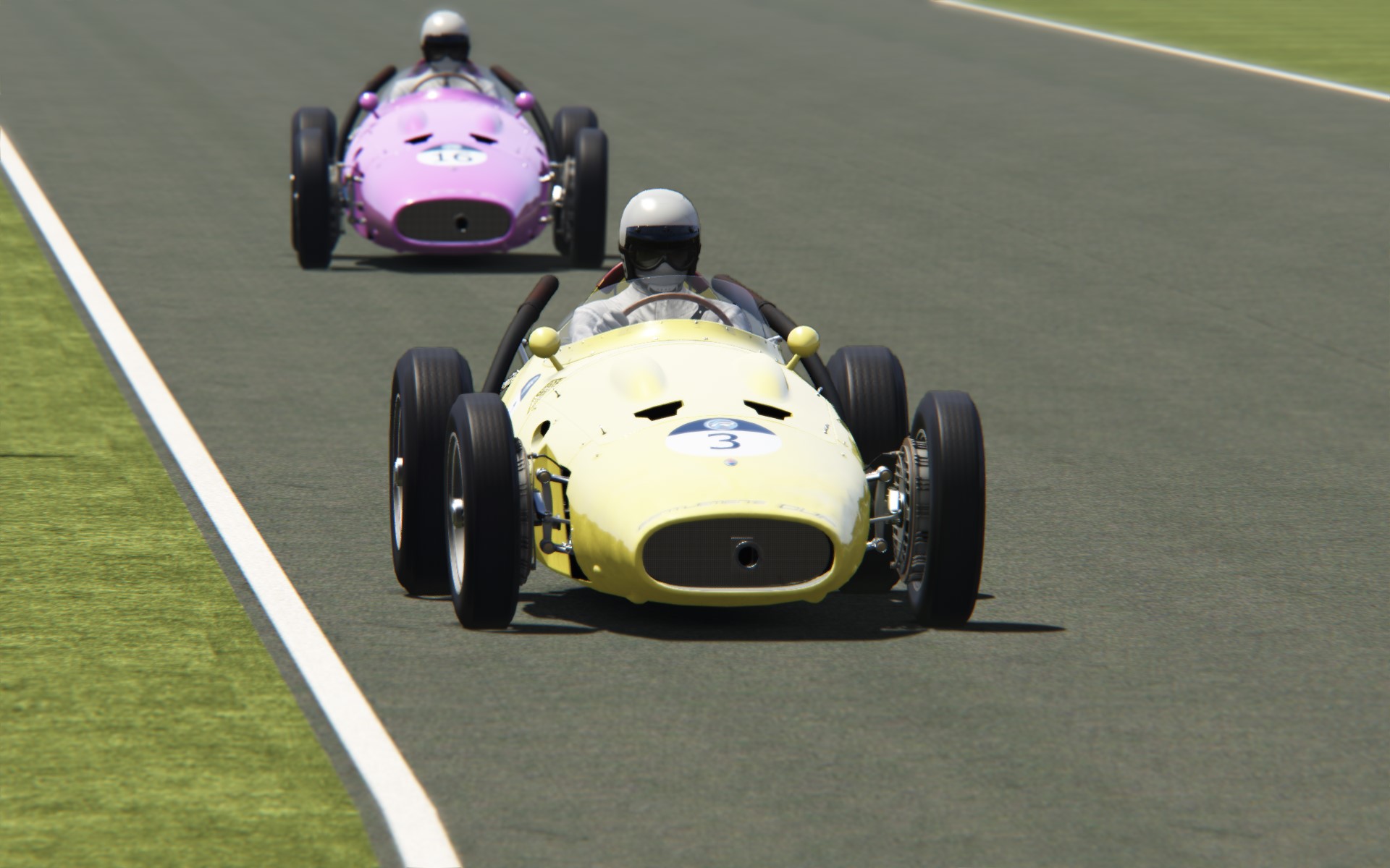 Rennen drei des Gentlemen Cup. Diesmal stilvoll im offenen Maserati 250F 12 Zylinder. Wackere Recken stellen sich der Herausforderung, und schon stehen sechs todesmutige Fahrer am Start des schnellen französischen Kurses. Polesetter Benjamin Oses legt gleich tapfer los und behauptet seine Führung, der zweitplazierte Mike Roller hat Pech, sein Flachmann rutscht unters Gaspedal und er fällt ans Ende des Feldes zurück. Louchart schnappt sich Platz zwei und stürzt sich sogleich in einen epischen Zweikampf mit Benjamin Oses, der sich durch stetige Führungswechsel auszeichnet. Klaus Weber zementiert Rang drei, vor Gert Ackermann. Dahinter prügelt Benny Kammer entspannt seinen historischen Open Wheeler dem Feld hinterher, den verhalten Gas gebenden Mike Roller im Nacken, der immer noch seinen Flachmann sucht, nun unterm Kupplungspedal.