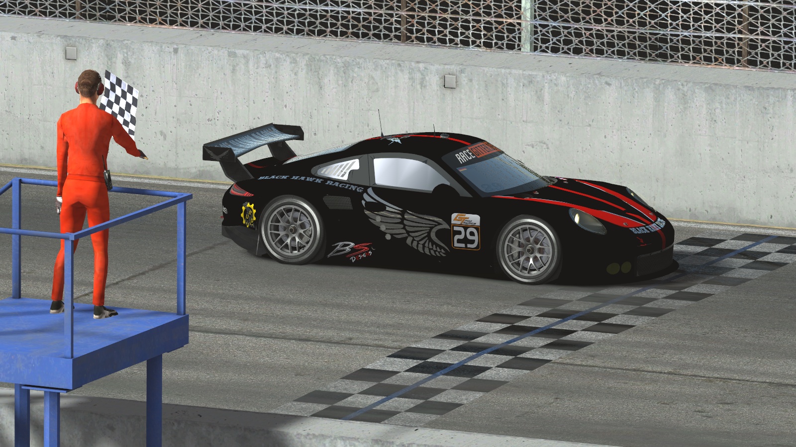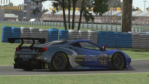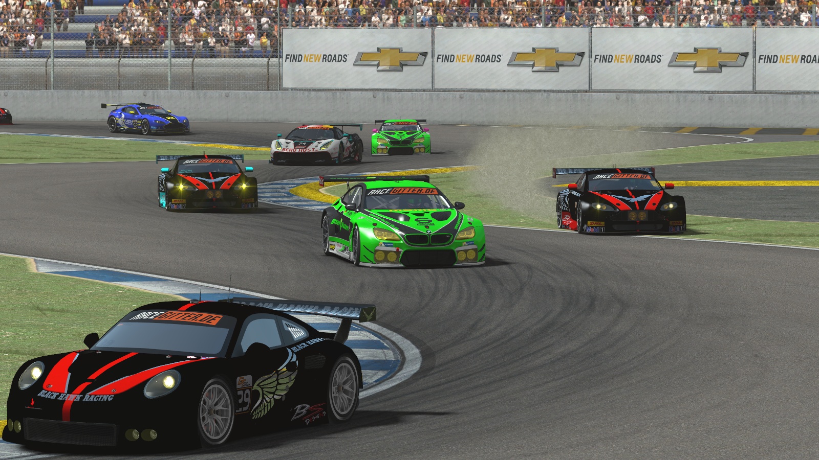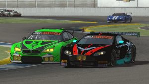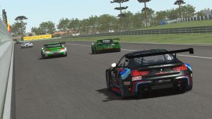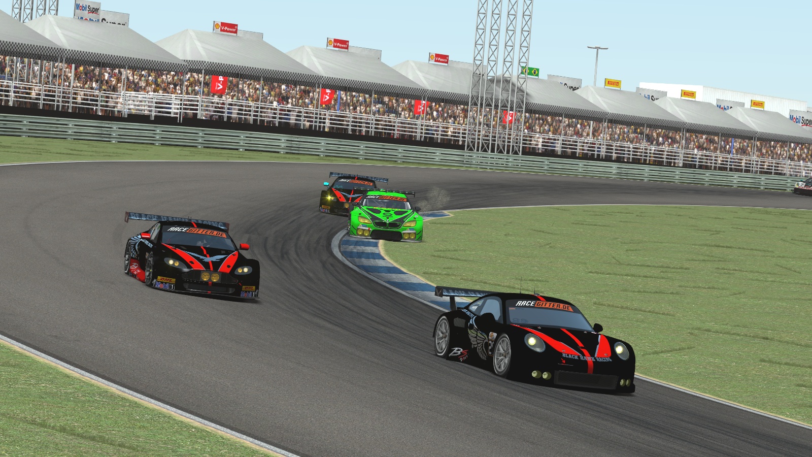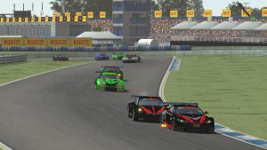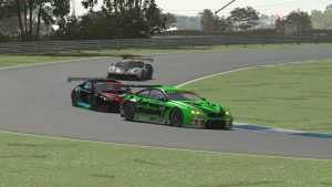 …entbrannte dagegen unter den Verfolgern. Runde 5, Anfahrt Kurve 1: Bräutigam holt sich Rang 2 von Heinen zurück. Mike Horn, ebenfalls für Black Hawk Racing am Steuern und Serienneuling Gerhard Lindauer in Diensten von MRS-SimRacing I komplettierten das dichte Verfolger-Quartett. Schnell konnte sich auch Bräutigam lösen und die tratt die Flucht nach vorne an. Zunächst blieb das verbliebene Trio beieinander bis auch Lindauer nicht mehr folgen konnte. Bis zur 48. Runde hing Mike Horn fast durchweg im Getriebe von Felix Heinen bis er sich schlussendlich durchsetzen konnte. Nebeneinander ging’s durch die Schikanen in Turn 1 bis 3, dann entschied der besser Kurvenausgang in T3 zugunsten von Horn. Zwar setze auch er sich in der Folge allmählich ab, doch Heinens 4. Rang war noch nicht gesichert. Ein Missverständnis bei einer doppelten Überrundung kurz vor Rennende warf Heinen noch auf den 6. Platz zurück.