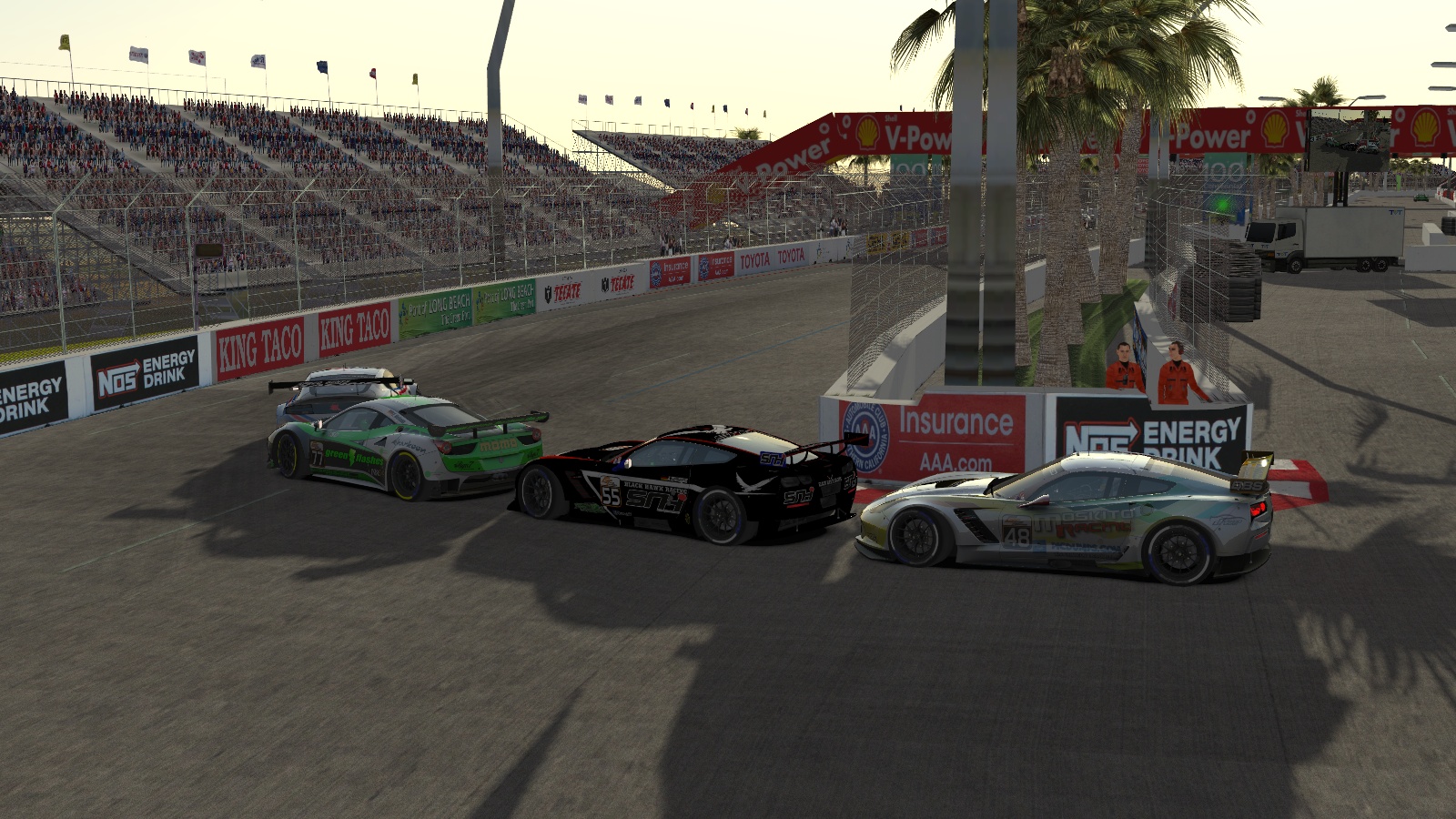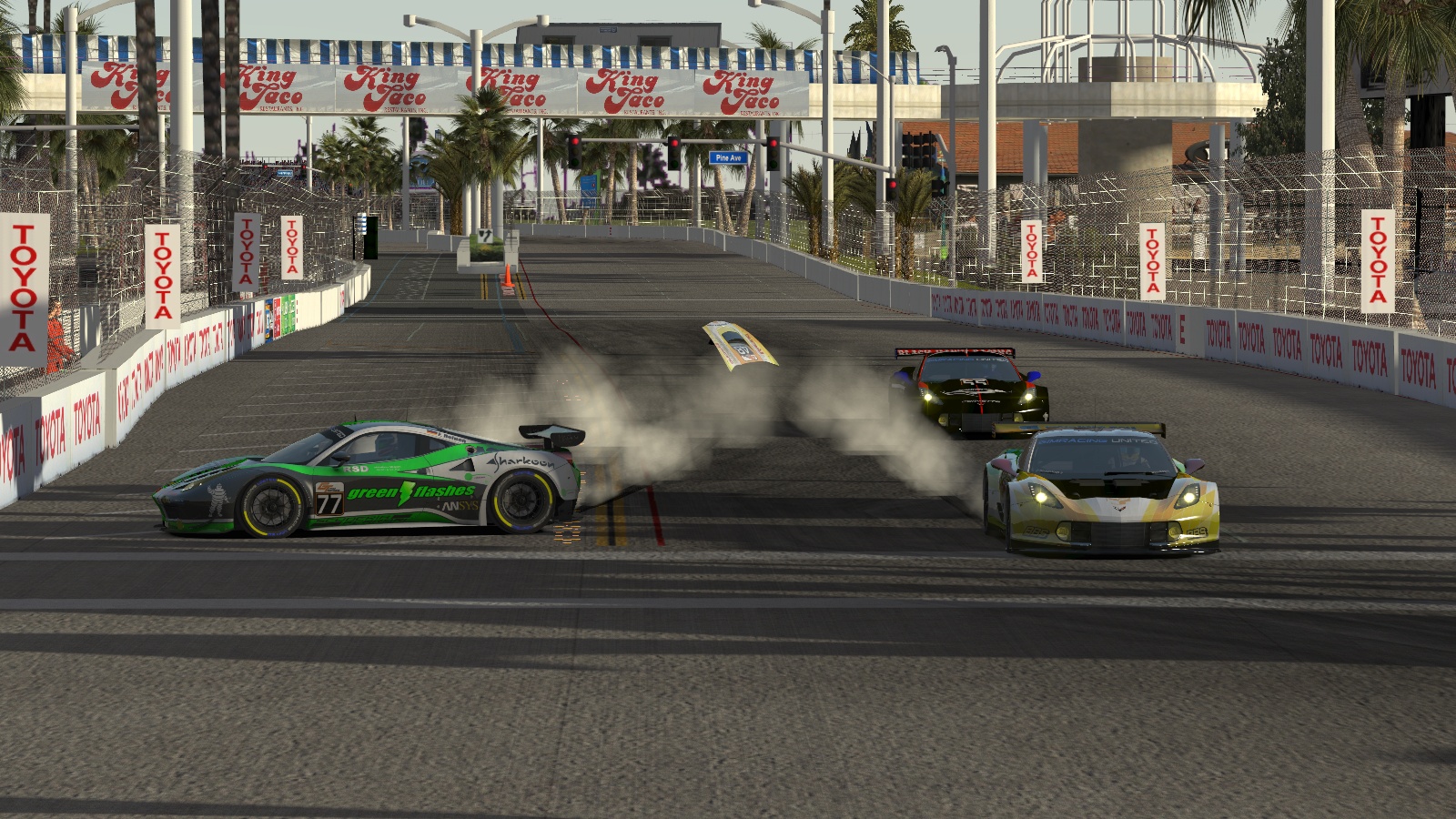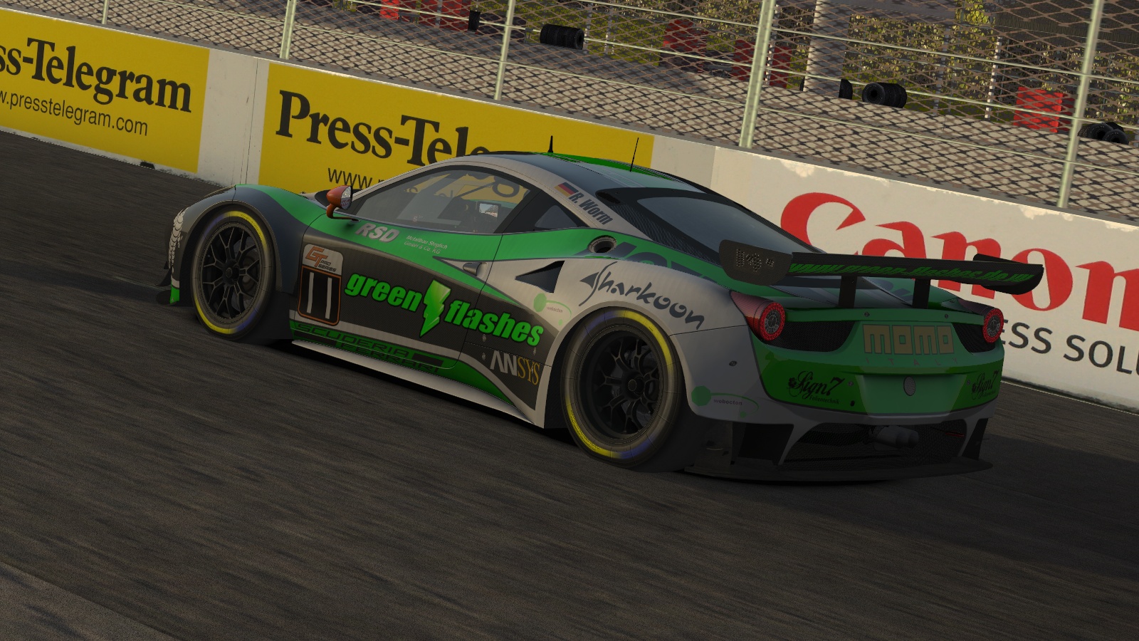 Selten, aber wahr: Die 1. Runde lief unfallfrei ab. Im Vorderfeld blieben auch größere Verschiebungen aus, einzig Felix Heinen schob sich am Teamkollegen Frühauf und dem Meisterschaftsführenden Bräutigam vor auf P4. 11 Runden lief das Rennen mit vereinzelten Aufregern im Mittel- bzw. Hinterfeld vor sich hin als die Teamkollegen Gogeissl und Striegler plötzlich die Plätze tauschten. Ein kleiner, aber folgenloser Verbremser Geogeissls hatte Striegler den nötigen Raum verschafft um durchzuschlüpfen. Ansonsten blieb es bis Runde 24 im Bereich der erweiterten Spitze weiterhin ruhig. Striegler lag mittlerweile gut 3 sek. vor Gogeissl in Führung, 6 sek. vor Gerzack und 12 sek. vor der Kampfgruppe Heinen, Bräutigam und Plattner. Plötzlich herrschte Unruhe im Stream. Felix Heinen und Christoph Plattner fielen deutlich zurück. Ein Blick ins Replay brachte die Auflösung: Plattner hatte sich beim Anbremsen auf Turn 1 hinter Felix Heinen völlig verschätzt und dabei den Green Flashes-Ferrari sowie sich selbst abgeräumt. Bräutigam, der lachende Dritte und die Konkurenten brachten ihre Fahrzeuge zur Reparatur an die Box. Mit einer Runde Rückstand und auf P10 und P11 liegend ging es für die beiden Unfallbeteiligten weiter. Die Freude Bräutigams über das Geschenk war bereits gewichen, fern von Freund und Feind hieß auf dem 4. Rang die Konzentration hoch zu halten und schon passierte es.