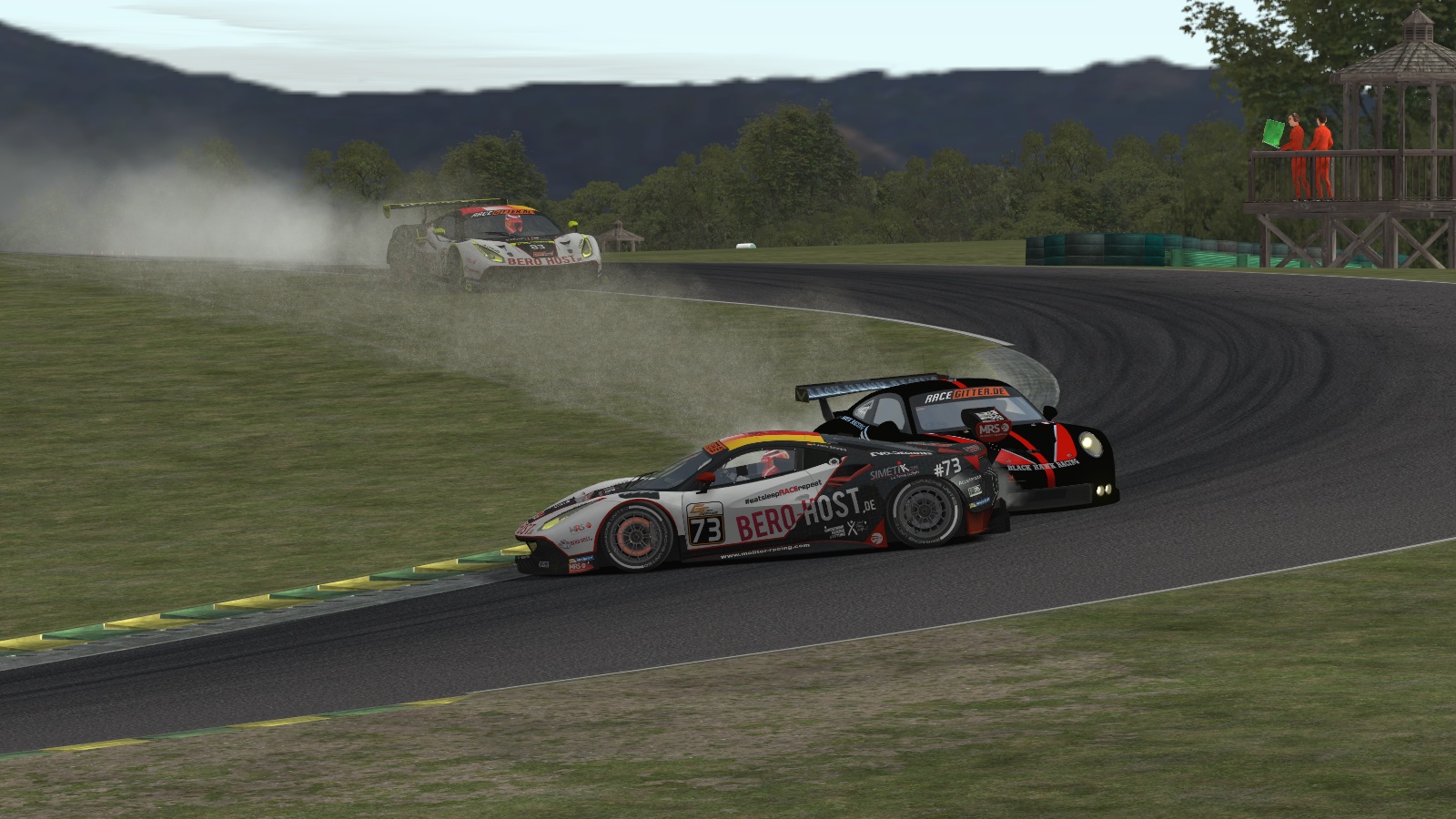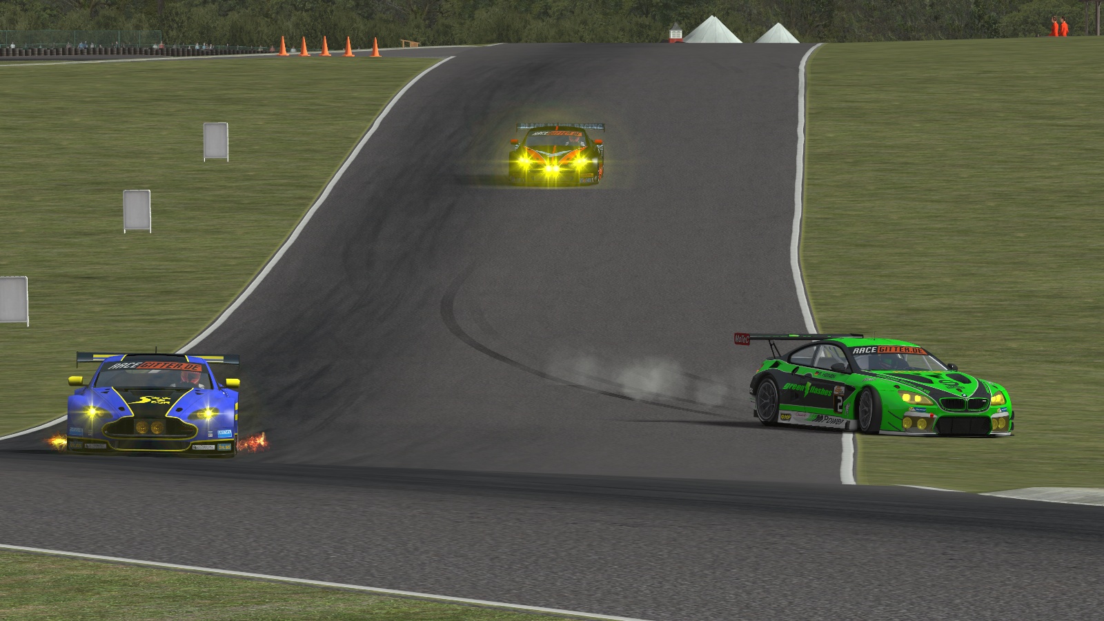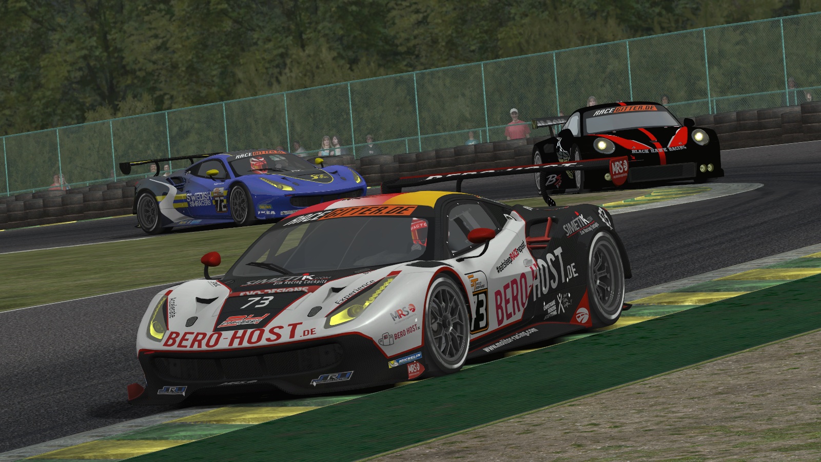 Erneut keine Unfälle in der Eröffnungsrunde, da kam die ReKo im Nachhinein ins Schwärmen über die hohe Disziplin. Die Top3-Piloten blieben zunächst unverändert und nach 3 Runden hatte man sich grob sortiert. Die ersten 5 Fahrer trennten jeweils 1,5 sek. und die Zuschauer hatten bereits zahlreiche harte, aber faire Duelle im sehr breiten Mittelfeld zu sehen bekommen. In Runde 8 reichte ein kleiner Fahrerfehler Sascha Glatters aus, um Andreas Schmich auf Rang 2 zu befördern und Glatter fand auch noch den Swedish Sim Racers I-Piloten Rickard Nilsson formatfüllend im Rückspiegel. Gerade mal einen Umlauf später spielte die Technik dem Spitzenreiter Markus Walter einen Streich; Abflug in den schnellen S-Kurven T7 bis T9, Einschlag, Frust, Feierabend. In der Folge rückten die aktuellen Podiumsanwärter zunächst immer näher zusammen und entzerrten sich dann wieder ein wenig.