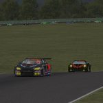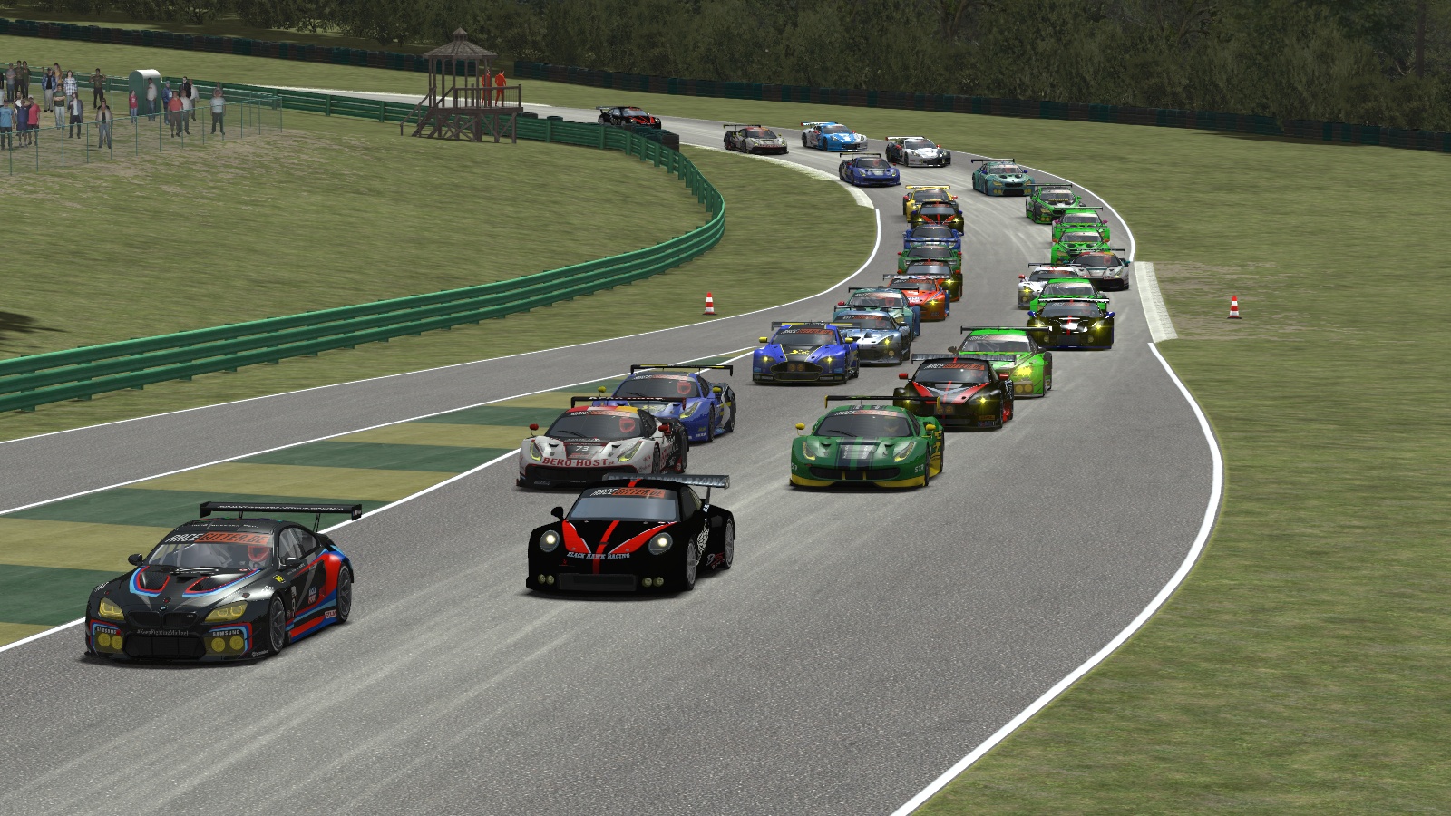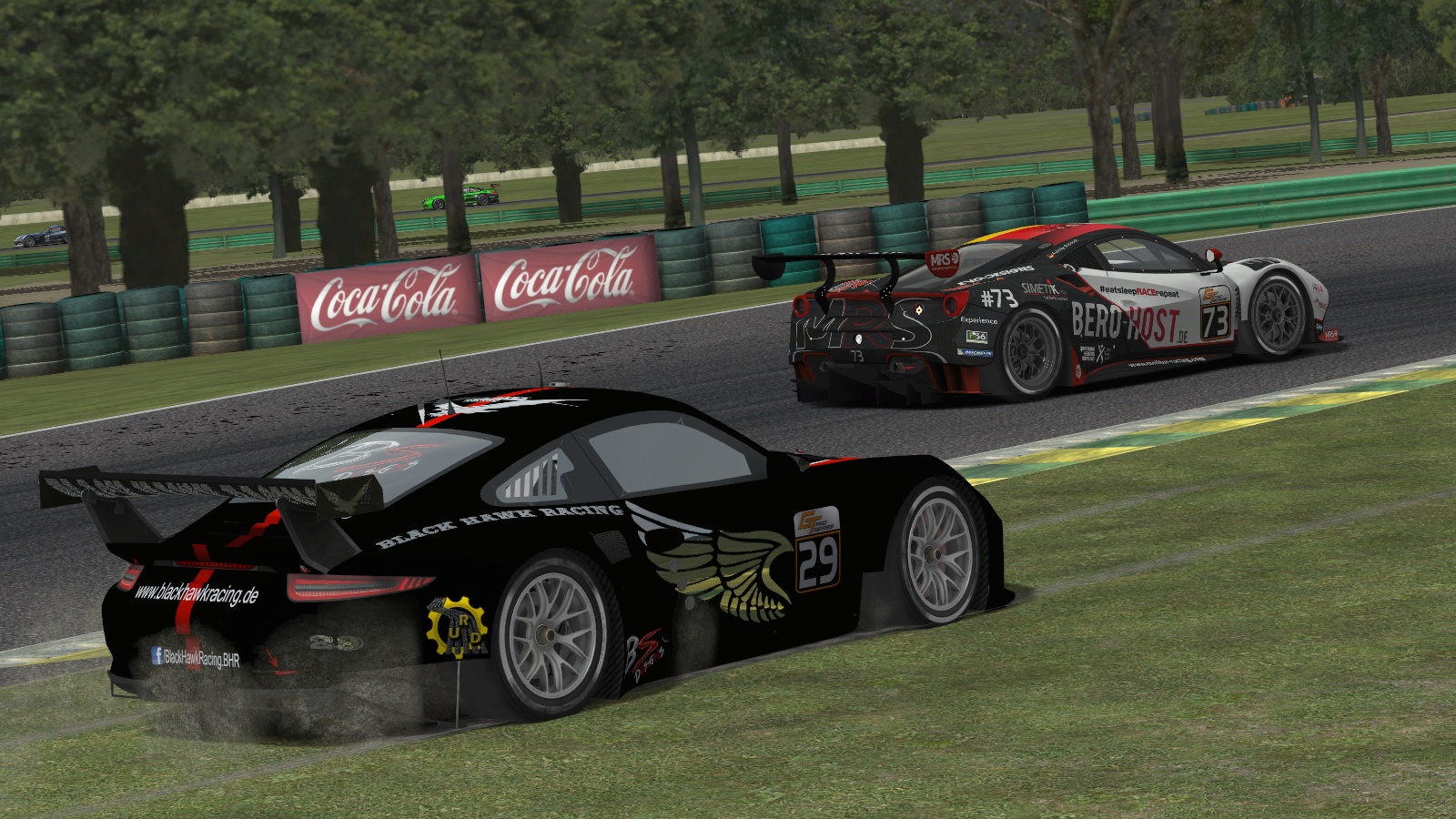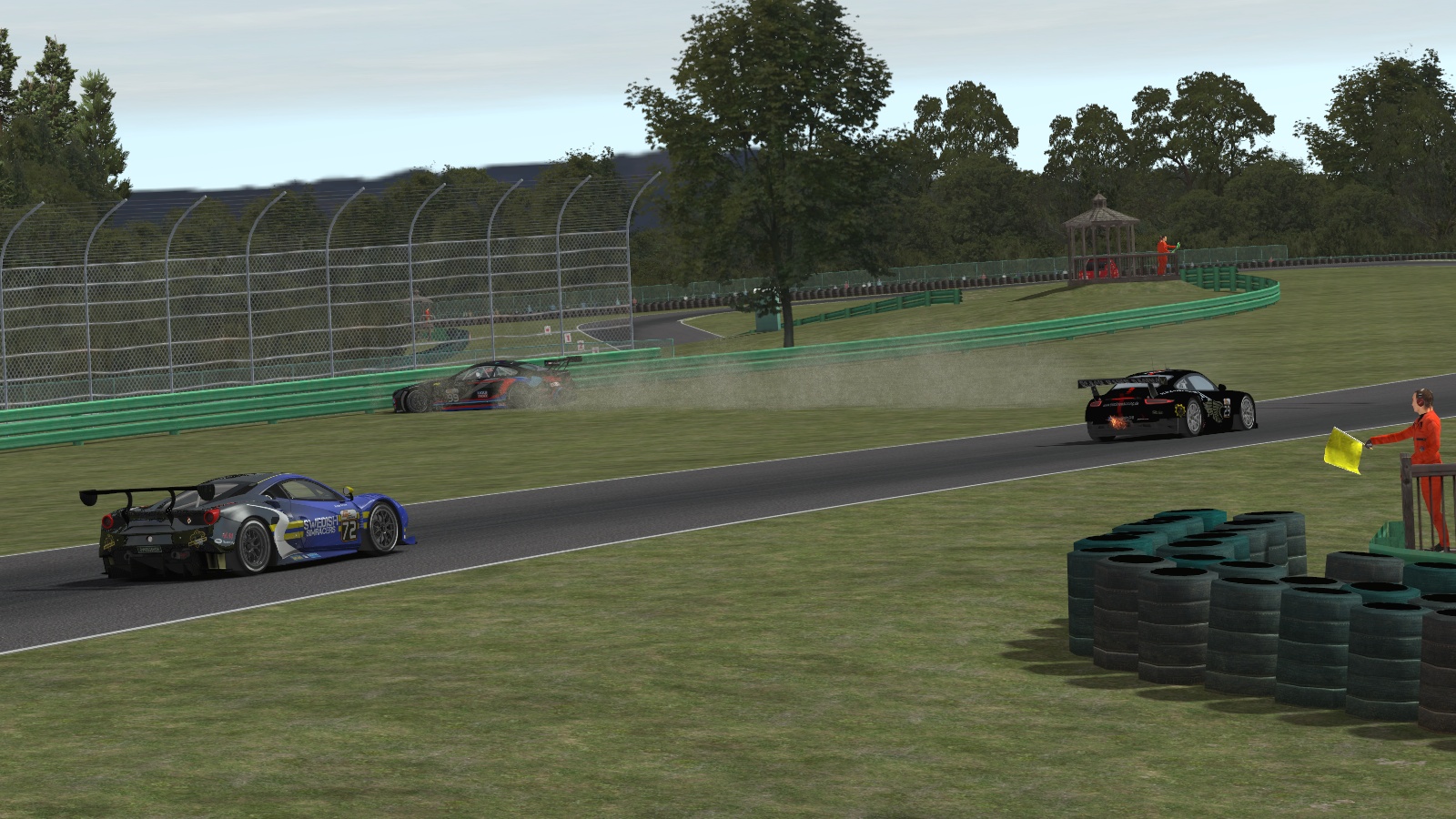 Erneut keine Unfälle in der Eröffnungsrunde, da kam die ReKo im Nachhinein ins Schwärmen über die hohe Disziplin. Die Top3-Piloten blieben zunächst unverändert und nach 3 Runden hatte man sich grob sortiert. Die ersten 5 Fahrer trennten jeweils 1,5 sek. und die Zuschauer hatten bereits zahlreiche harte, aber faire Duelle im sehr breiten Mittelfeld zu sehen bekommen. In Runde 8 reichte ein kleiner Fahrerfehler Sascha Glatters aus, um Andreas Schmich auf Rang 2 zu befördern und Glatter fand auch noch den Swedish Sim Racers I-Piloten Rickard Nilsson formatfüllend im Rückspiegel. Gerade mal einen Umlauf später spielte die Technik dem Spitzenreiter Markus Walter einen Streich; Abflug in den schnellen S-Kurven T7 bis T9, Einschlag, Frust, Feierabend. In der Folge rückten die aktuellen Podiumsanwärter zunächst immer näher zusammen und entzerrten sich dann wieder ein wenig.