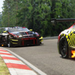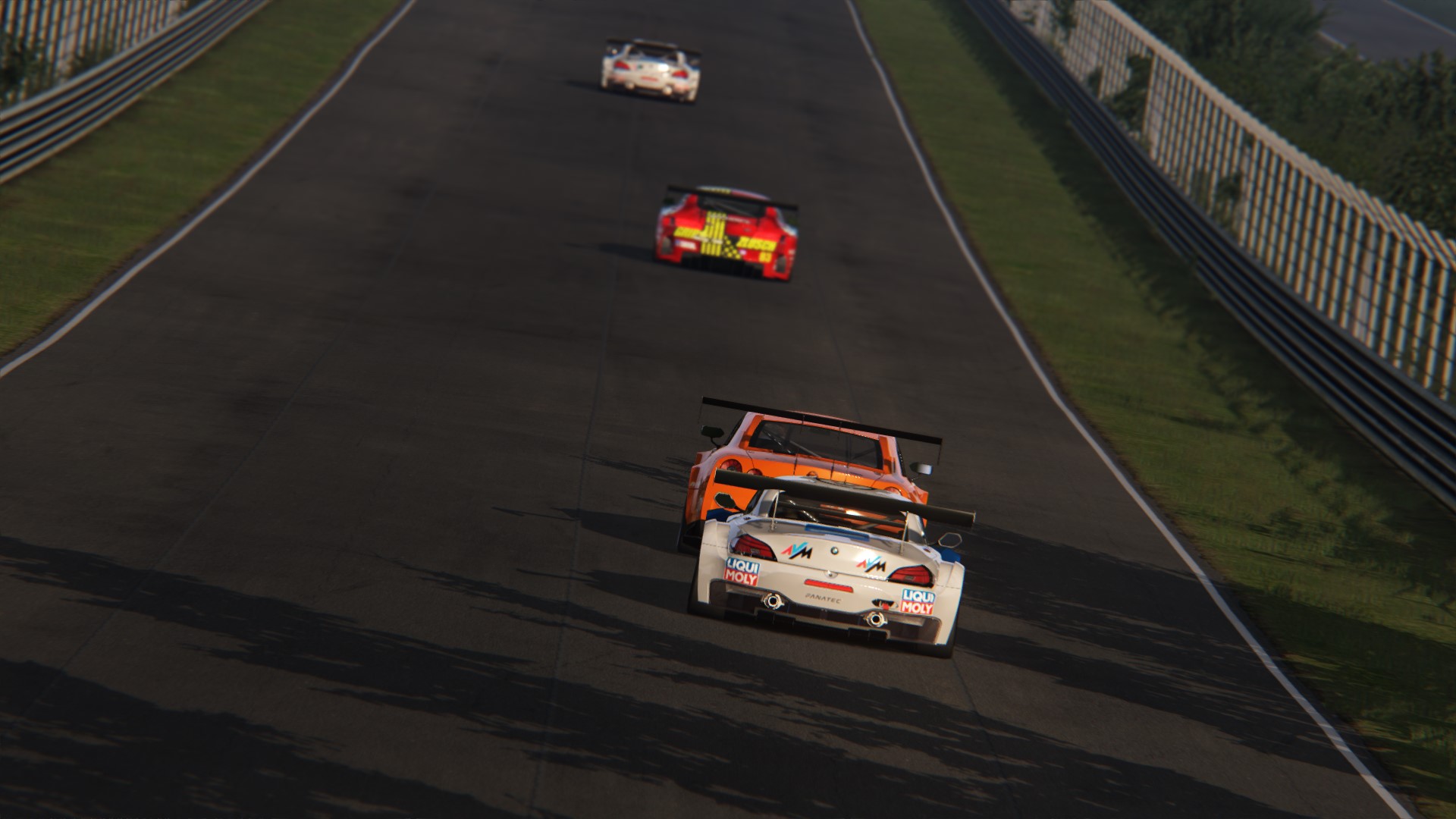 An der Spitze gehen Schmitt und Zlusch nebeneinander durch den Abschnitt Antoniusbuche, nachdem Zlusch nicht vom Windschatten auf der Döttinger Höhe profitieren konnte. Mit dem Lolli zwischen den Zähnen zwängt er sich an Schmitt vorbei, aber….er verliert den AMG GT3 beim Anbremsen! Allerdings so elegant über den Grünstreifen driftend, das Roersch nicht vorbeigehen kann. Im Mittelfeld kämpfen Thomas Huebner, Heiko Sanders und Stephan Gautschi hart aber fair miteinander, und Gautschi erkämpft sich dabei Rang 12 von Sanders. Manuel Lange parkt seinen arg verformten Ferrari derweil an der Box, die Mechaniker versuchen anhand von Werksbroschüren und Zeugenaussagen, den Wagen zu rekonstruieren. Konieczny zwängt sich im Kampf um Platz 18 an Dominik Pieper vorbei, der so seine liebe Not mit der Strecke und mangelndem Training hat. In dieser 3. Runde liegt Walter Hampf nunmehr auf Rang 14., in der GT2-Klasse tummelt sich Jürgen Dost, entspannt klassische Musik hörend, auf der 22. Position. Hampf dreht weiter auf, geht an Sanders vorbei. Auch Johannes Peiter und Michael Nord folgen diesem Beispiel.